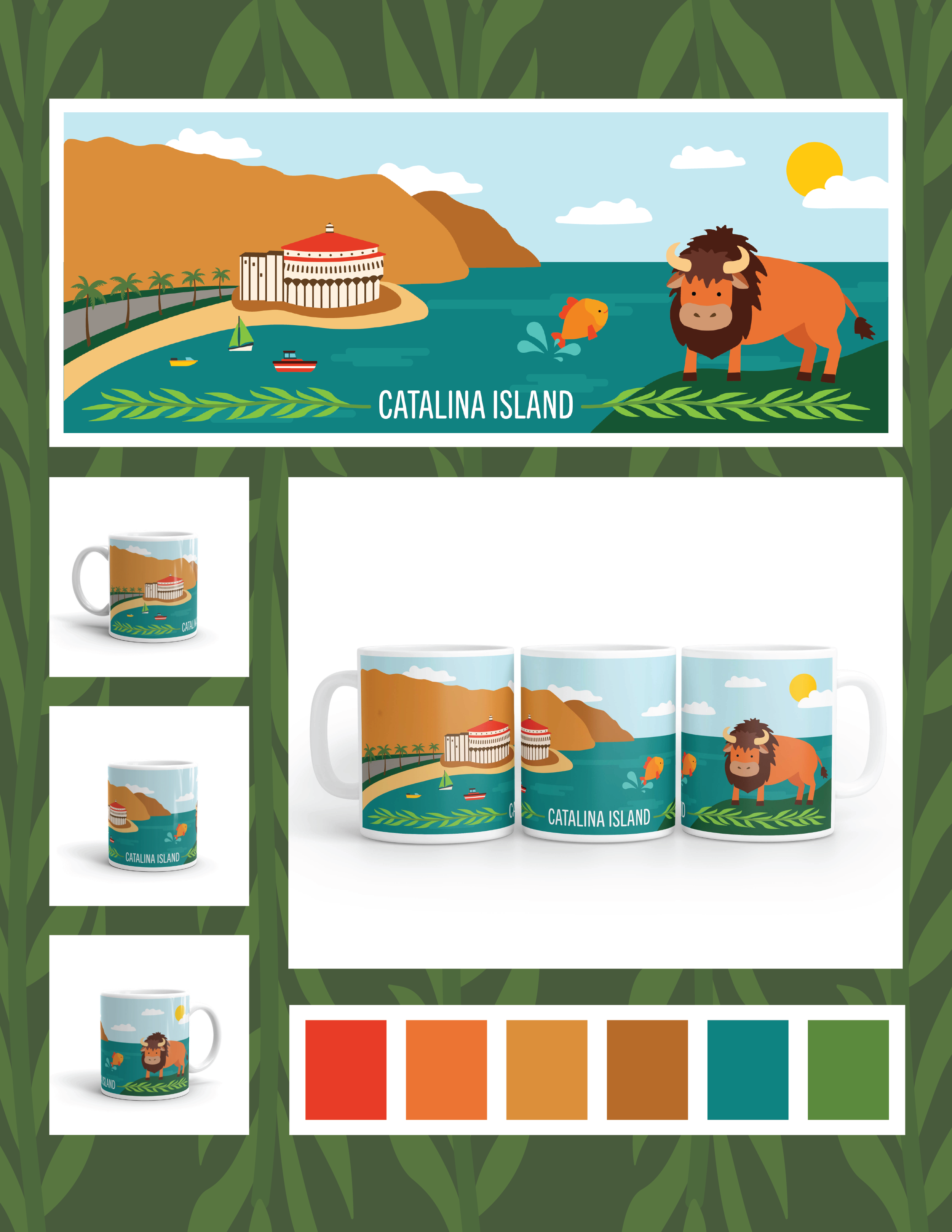 This illustration highlights the main attractions of Catalina Island. The colors are realistic to the actual features of the island but also more vibrant. The long composition of the artwork can be adapted to different products you could find in a gift store, such as mugs and postcards.