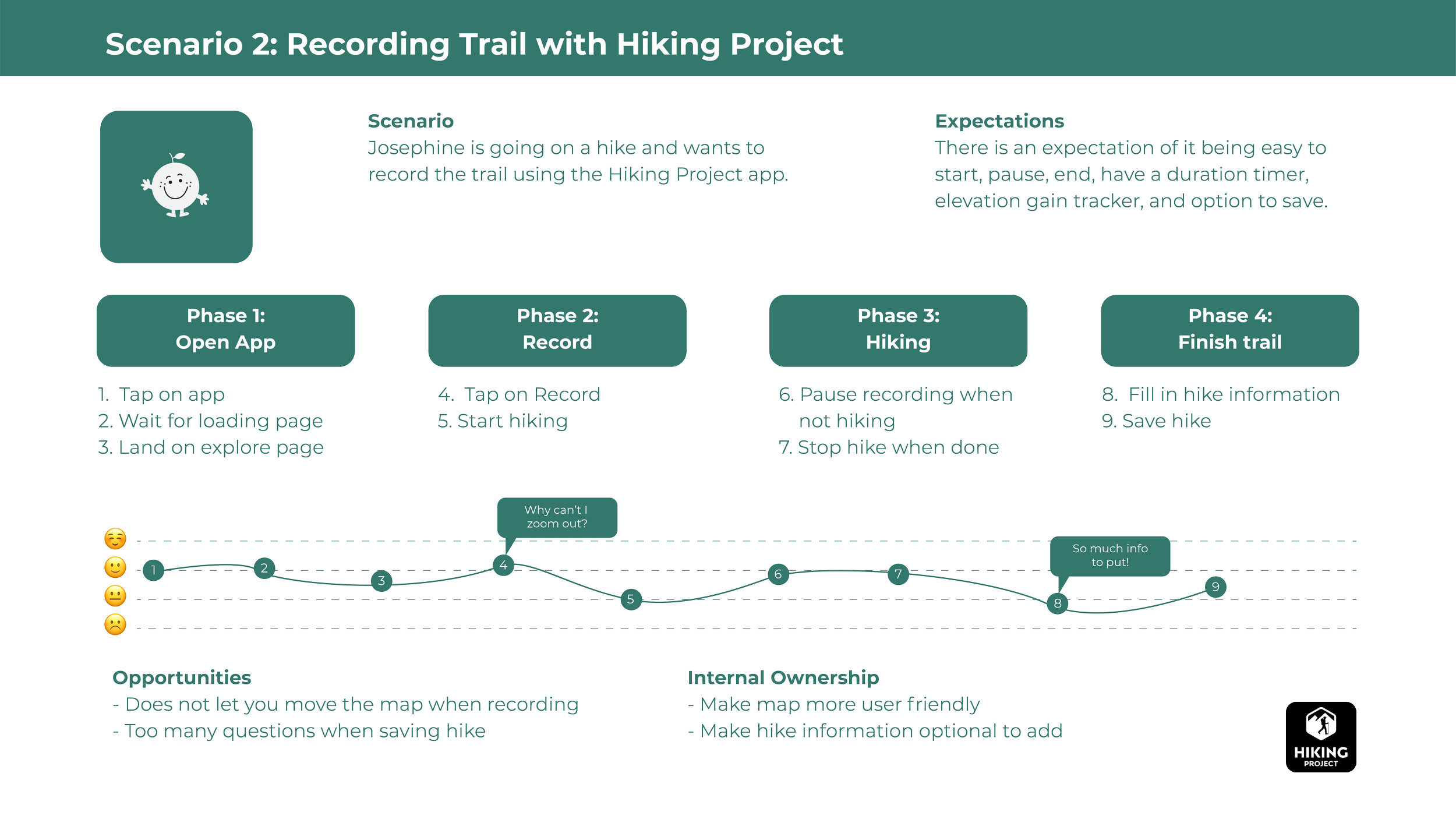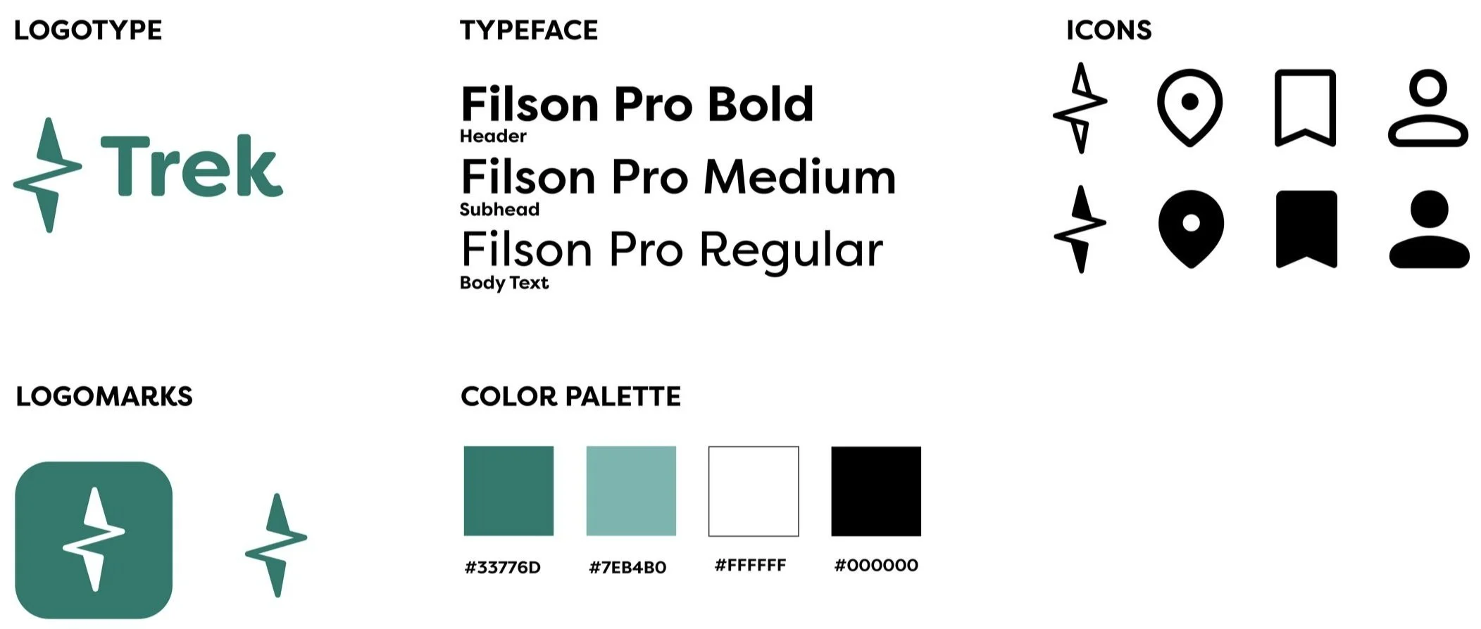 Trek is a UI/UX redesign project of an existing hiking app, The Hiking Project. User journey personas and maps were made that helped identify problems one may encounter when using the app. There was a lack of ease when navigating from different menu pages, and the biggest problem I found was the hike recording function. I focused on solving those problems when creating Trek. I also designed a new logo, chose a different typeface and color palette, and overall new identity for the hiking app.